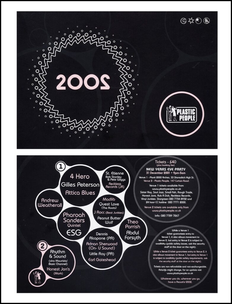 One of Ade’s biggest record was undoubtedly Pharaoh Sanders’ “You’ve Got To Have Freedom”. It got played almost every week and rapturous reactions would always follow (interestingly for a nerd like me, this is one of the very few records I can think of which were also played by David Mancuso (alongside “Life on Mars”, “Dancing In Outer Space” and “Expand Your Mind”. These records sounded radically different at both parties, clear and flowing at Lucky Cloud, impactful and physical at Plastics ). So when Ade decided to go large for NYE 2001 (watch the YT video above for the whole story), he built a whole line up around Pharaoh Sanders whom he wanted to play “My Favourite Things” at midnight. And what a line up that was!